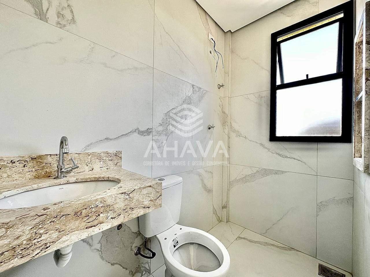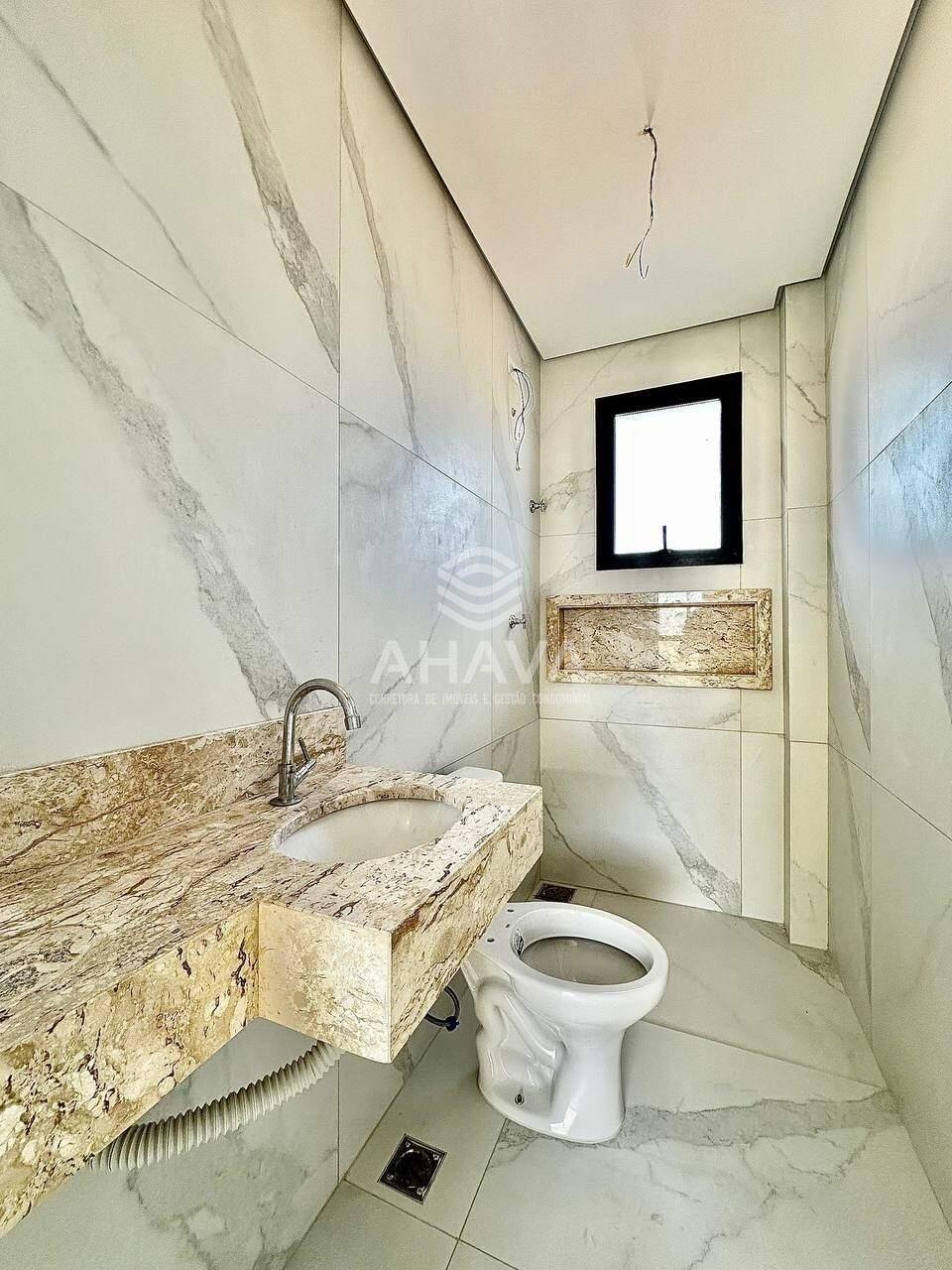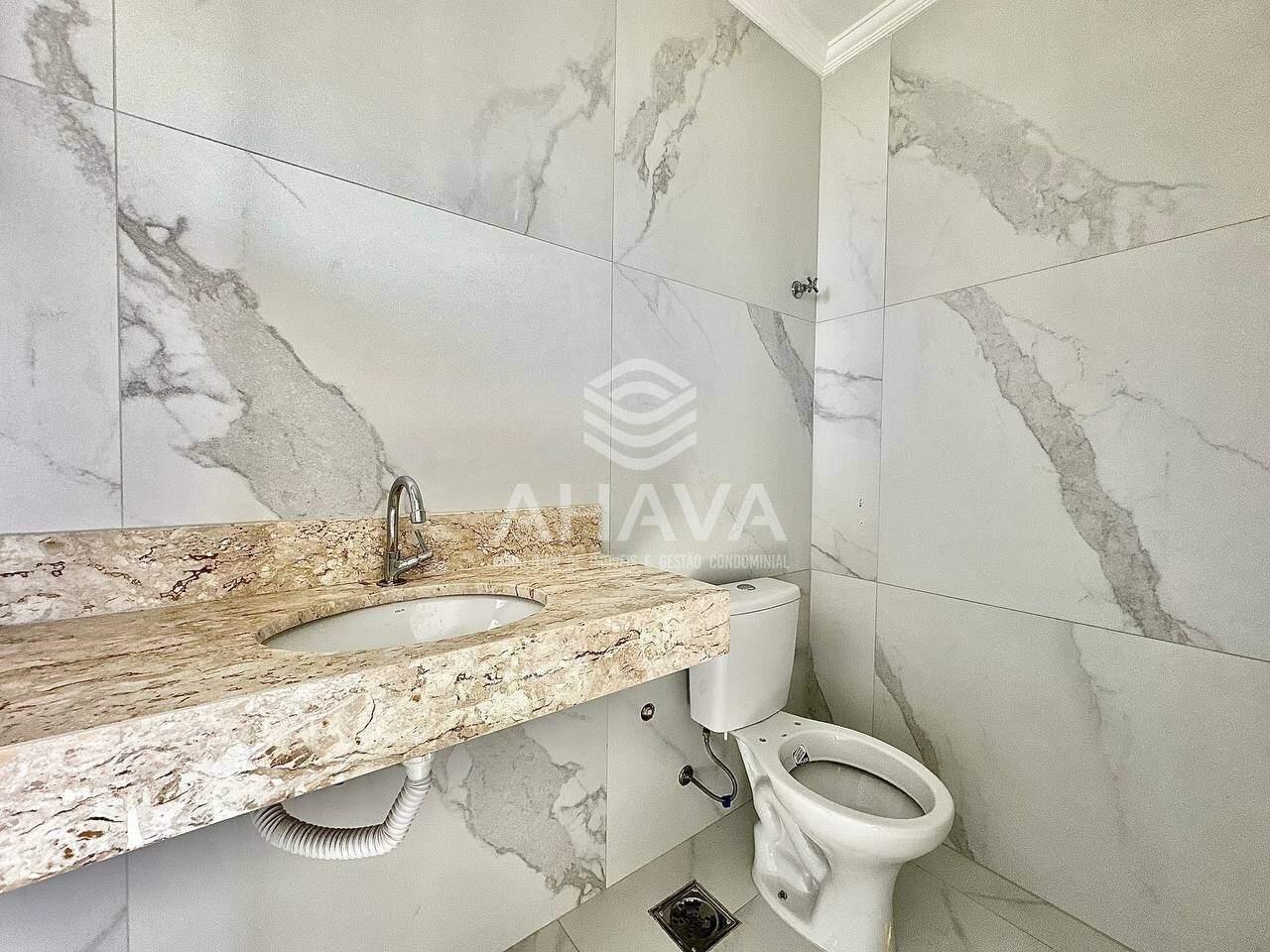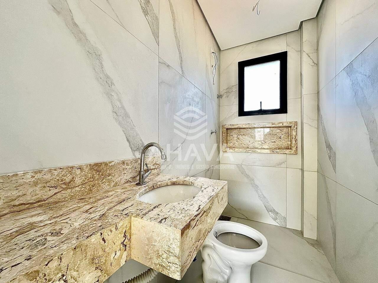 Banheiro da Suíte com bancada em mármore bege bahia e nicho na área de banho;