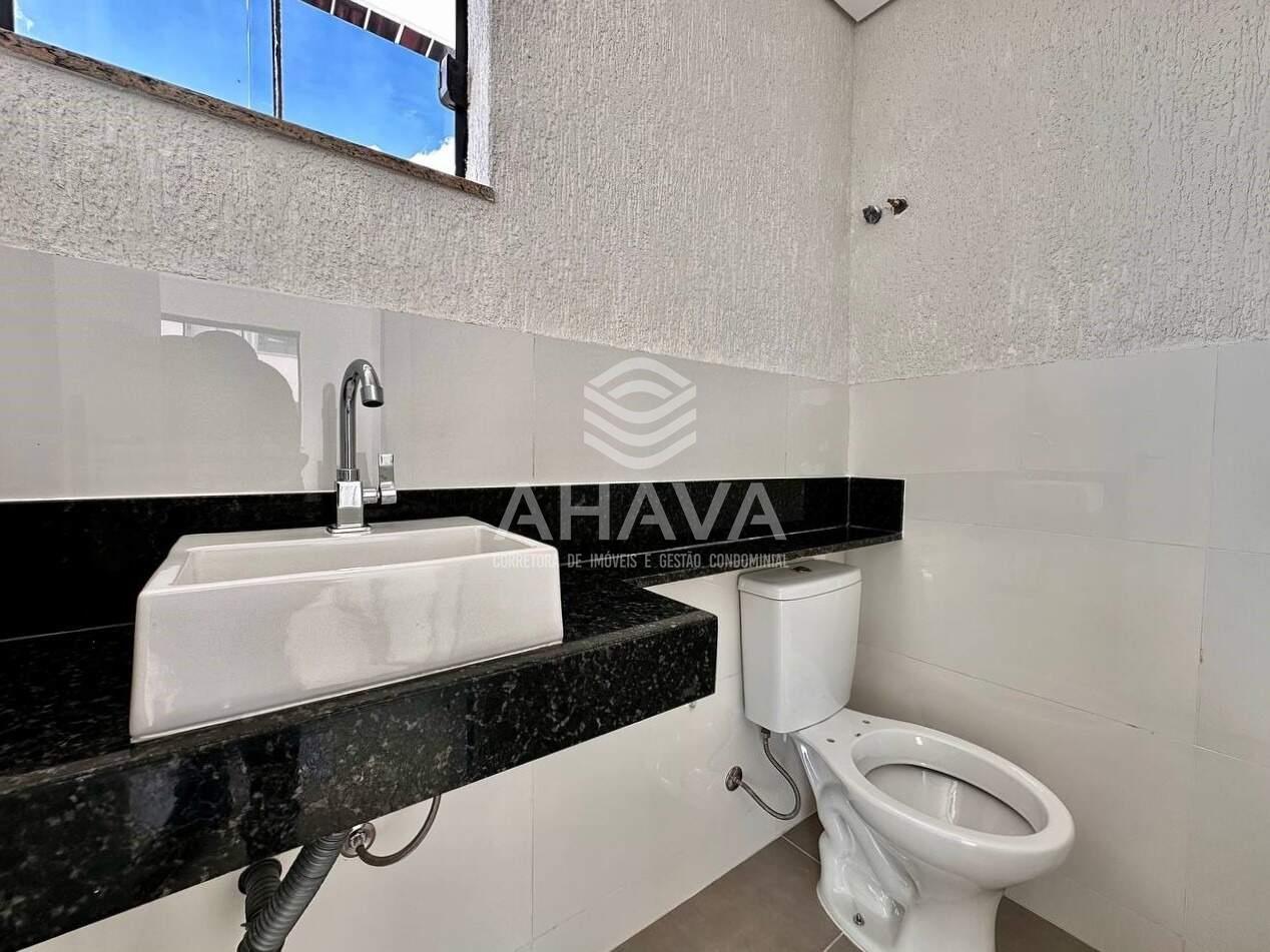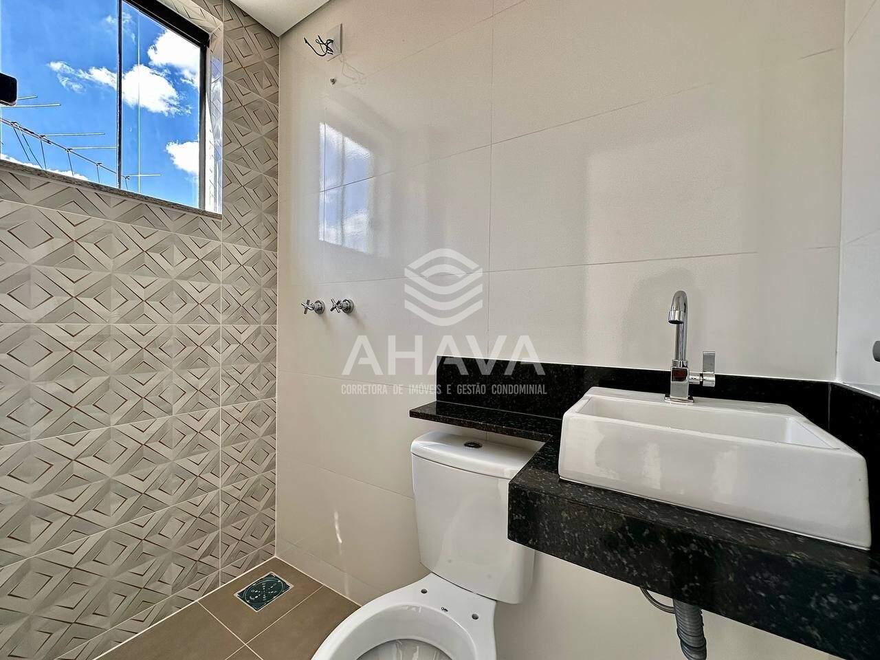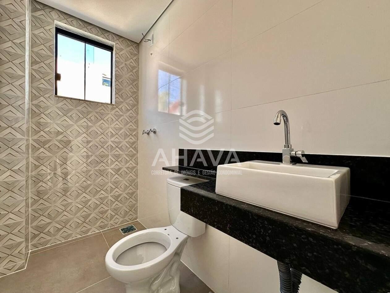 Banheiro social com bancada em granito, cuba da pia em apoio e pré-disposição para aquecimento solar na ducha