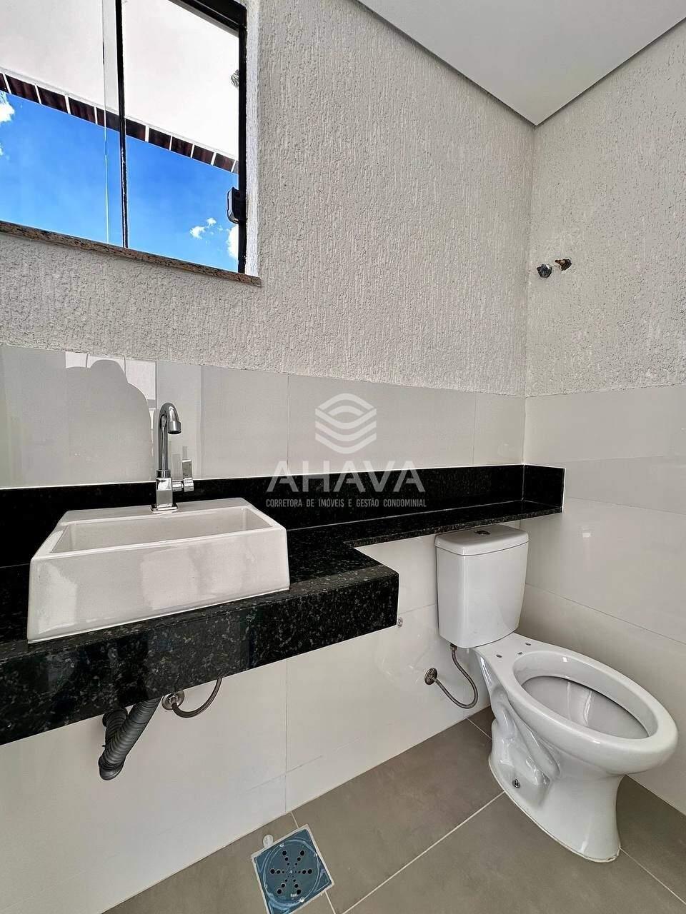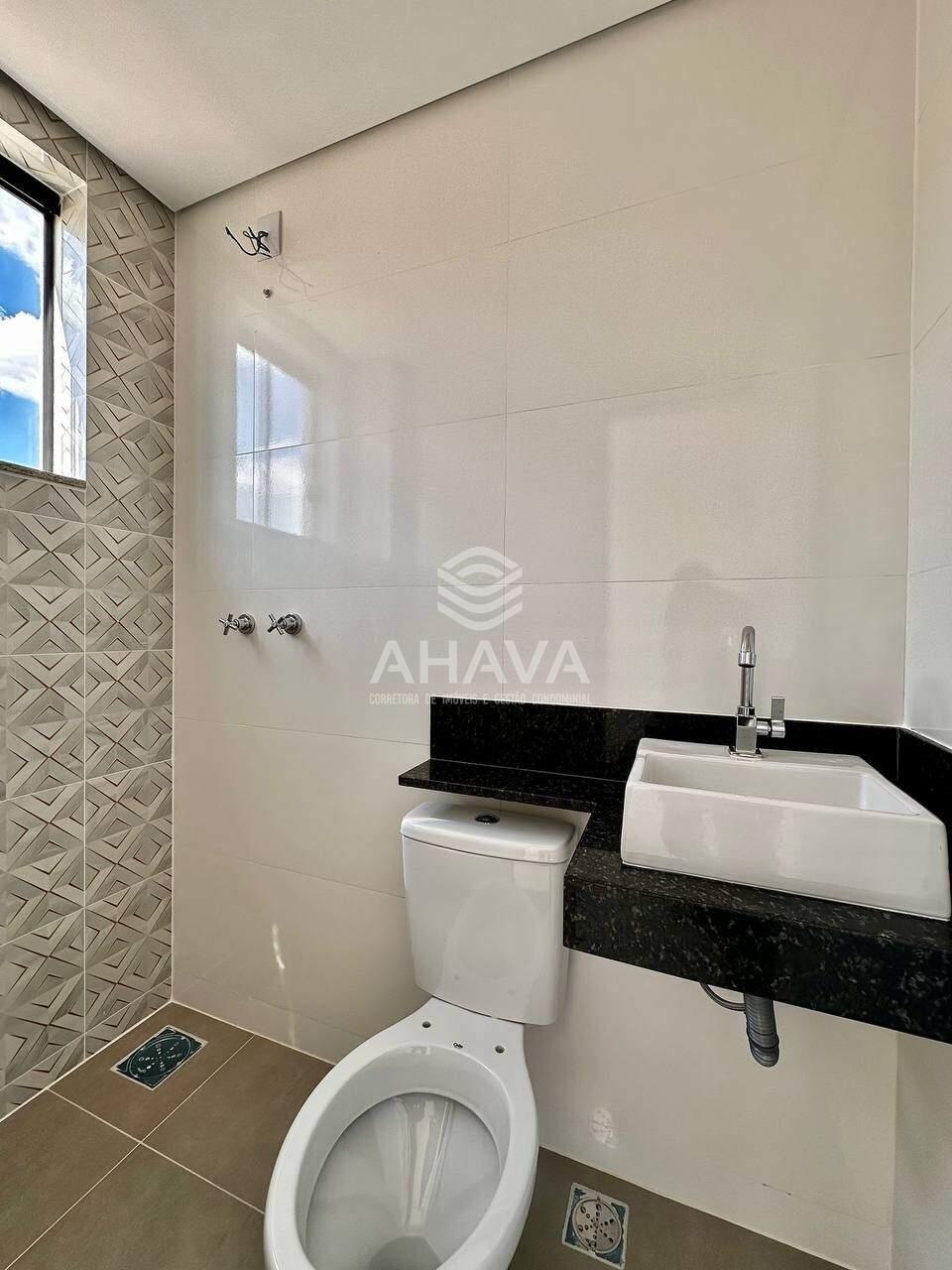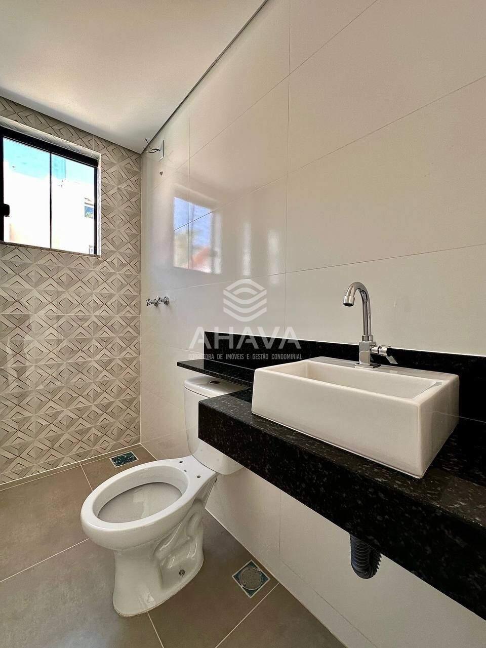 Banheiro social com bancada em granito, cuba da pia em apoio e pré-disposição para aquecimento solar na ducha
