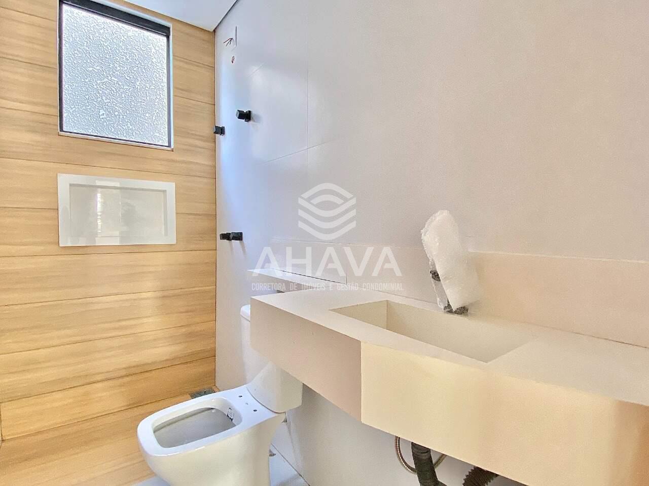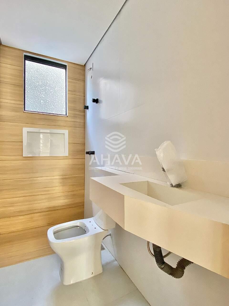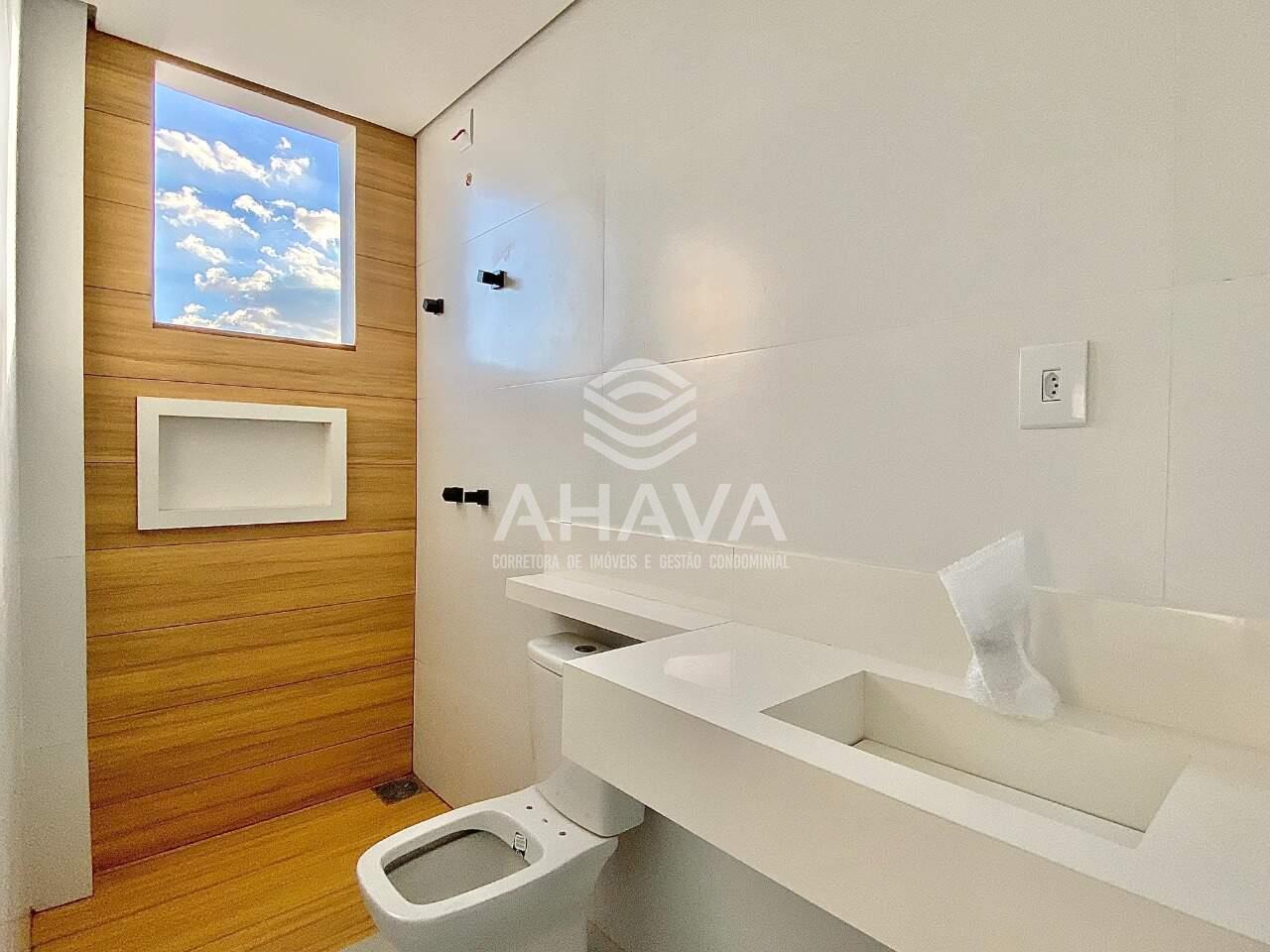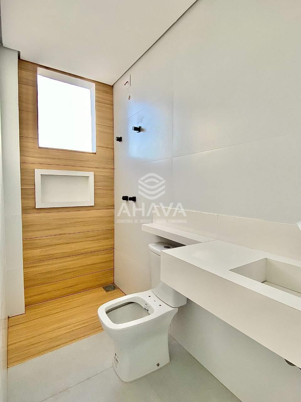 Banheiro da suíte com bancada em porcelanato, cuba da pia esculpida e nicho na área de banho;