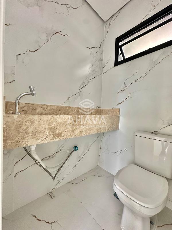 Banheiro da suíte com bancada em mármore bege-bahia, cuba dupla em apoio, nicho na área de banho e rebaixamento em gesso;