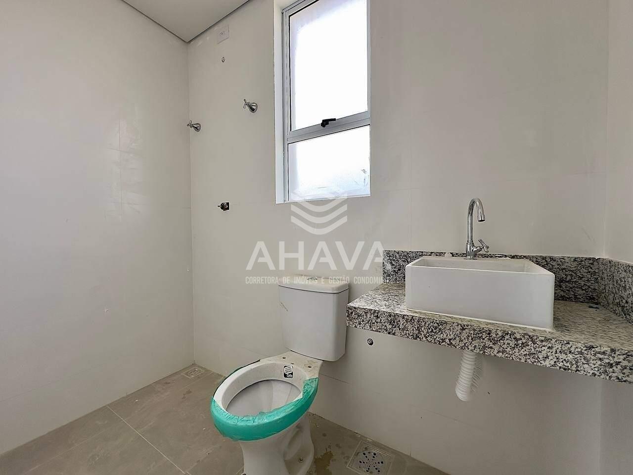 Banheiro social com bancada da pia em granito, cuba da pia em apoio, armário planejado, espelho e box em blindex;