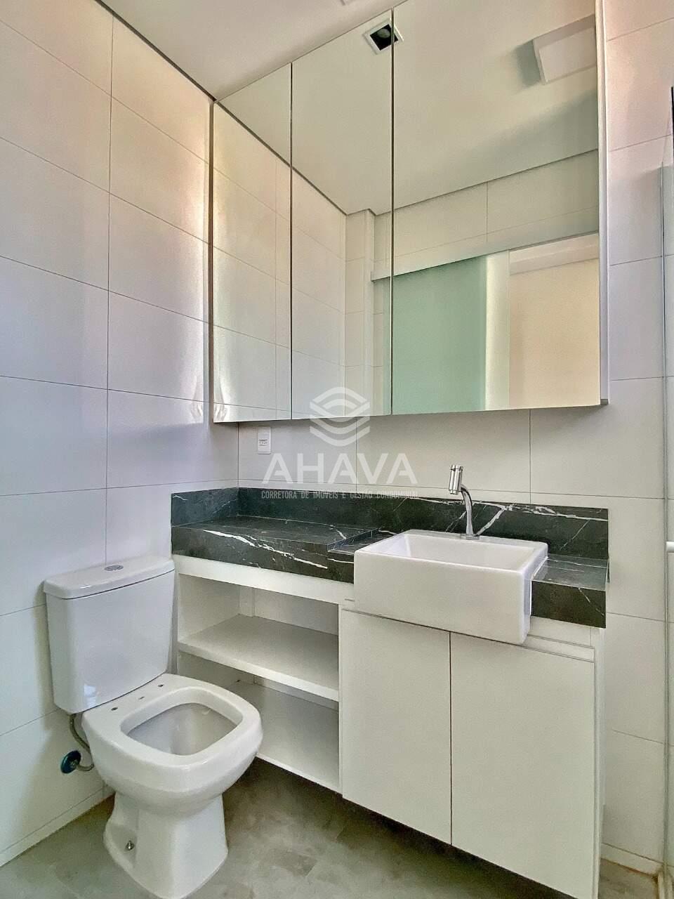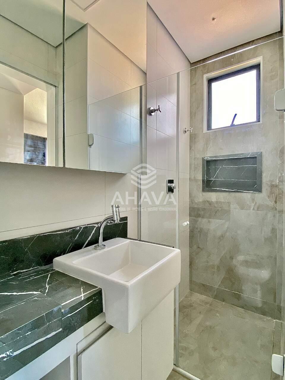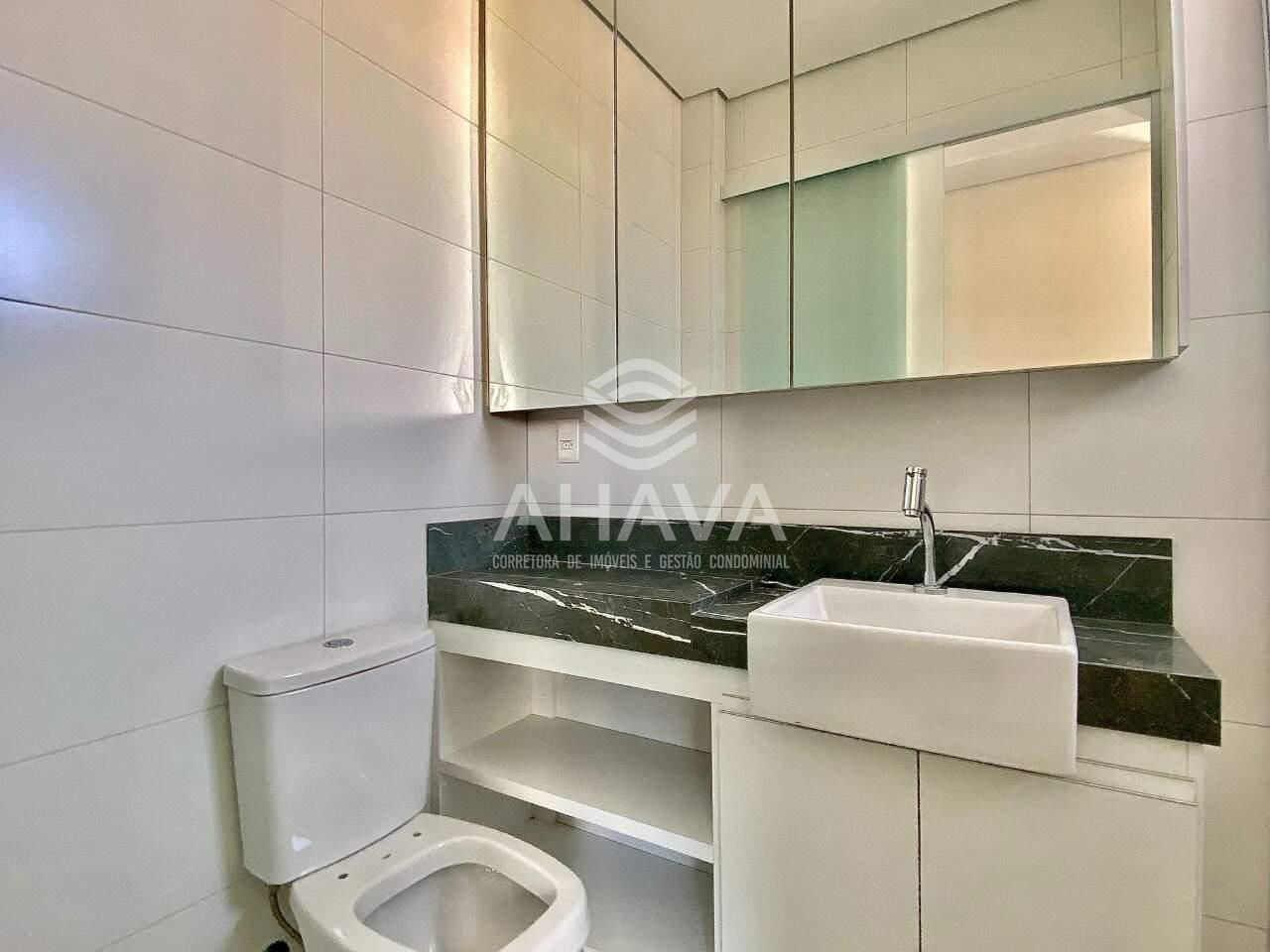 Banheiro social com bancada em porcelanato, cuba da pia em semi-encaixe, armário planejado, espelho e box em blindex 8mm;